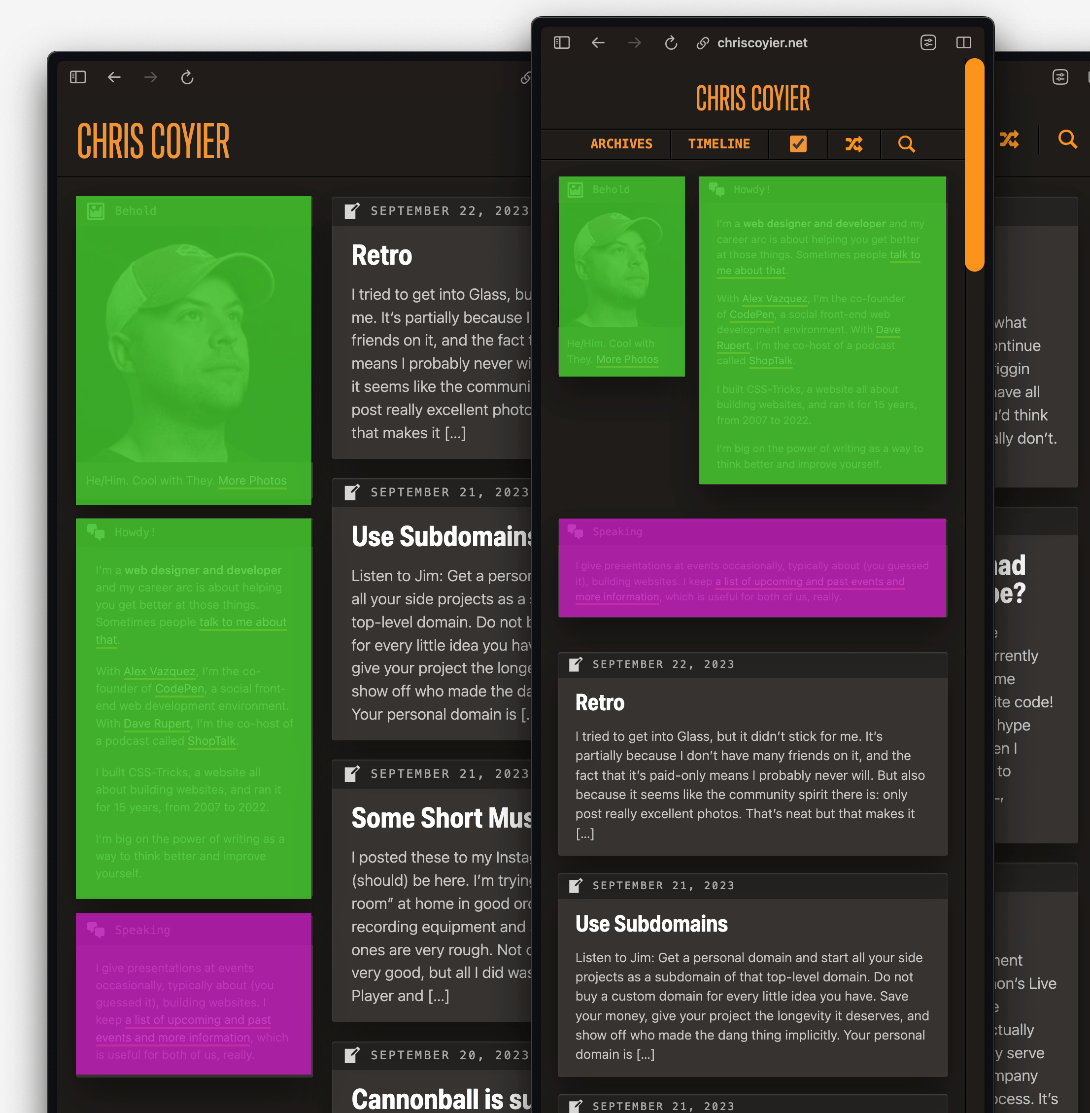 Part of why I wanted to play with this is because I saw that Safari 17 has shipped (on desktop next week), and I count twelve fixes for display: contents in the note. Now Safari is just one browser, and the fixes in bleeding edge version don’t make this a solved problem. I made the decision to use it because: